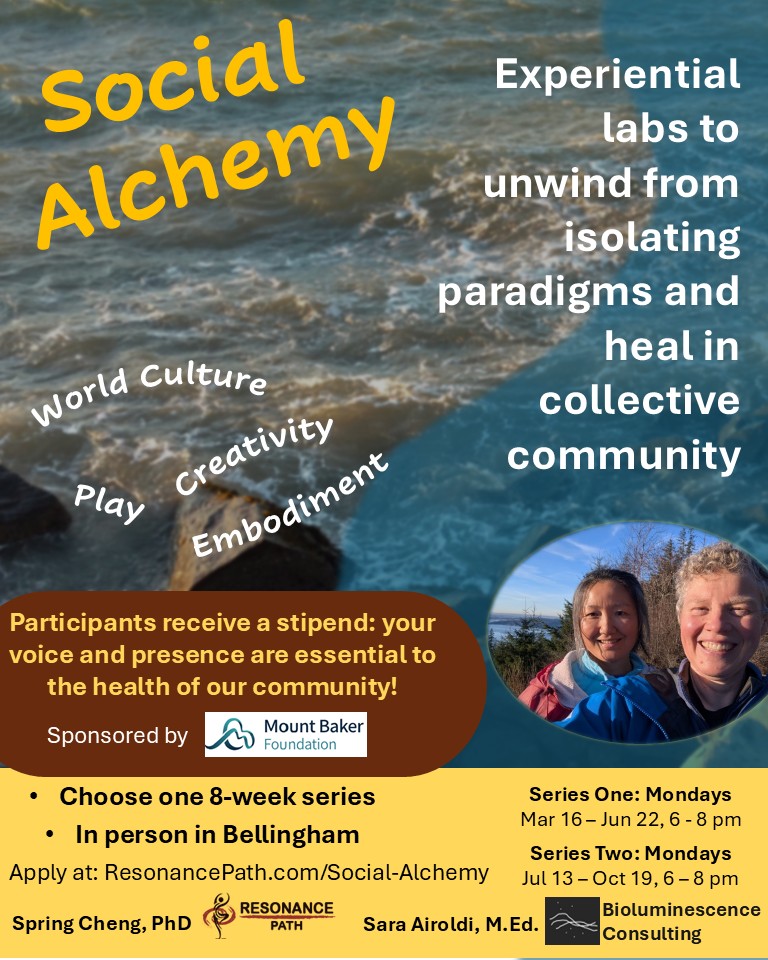 Social Alchemy is an experiential lab in our local community to grow and nurture another story of home. We practice healthy ways to inhabit our bodies, our relations, and the stories we tell ourselves. Our sources are the innate wisdom traditions of the Earth. This includes Spring’s Chinese ancestral teaching of East Asia and Sara’s diasporic influences from Europe and America, our teachers from around the world and you. Together we will take a journey home. And we will venture beyond, creating our own rituals and practices as they emerge.